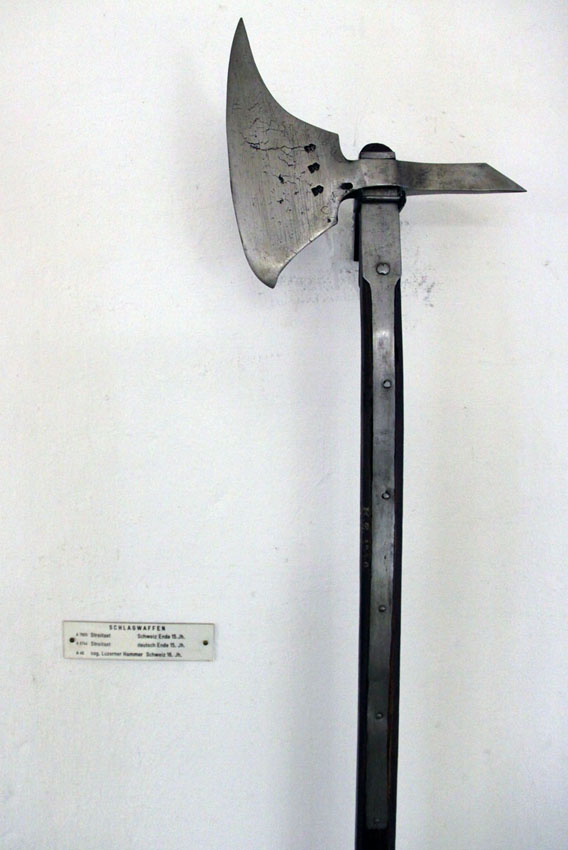 For comparison, here are two axes in Zurich which the museum dates to around 1620. Not exact matches certainly, but the back-spikes in particular are distinctly similar. Many later Swiss polearms manufactured for town armouries mimic earlier styles from the 15th or even 14th century...