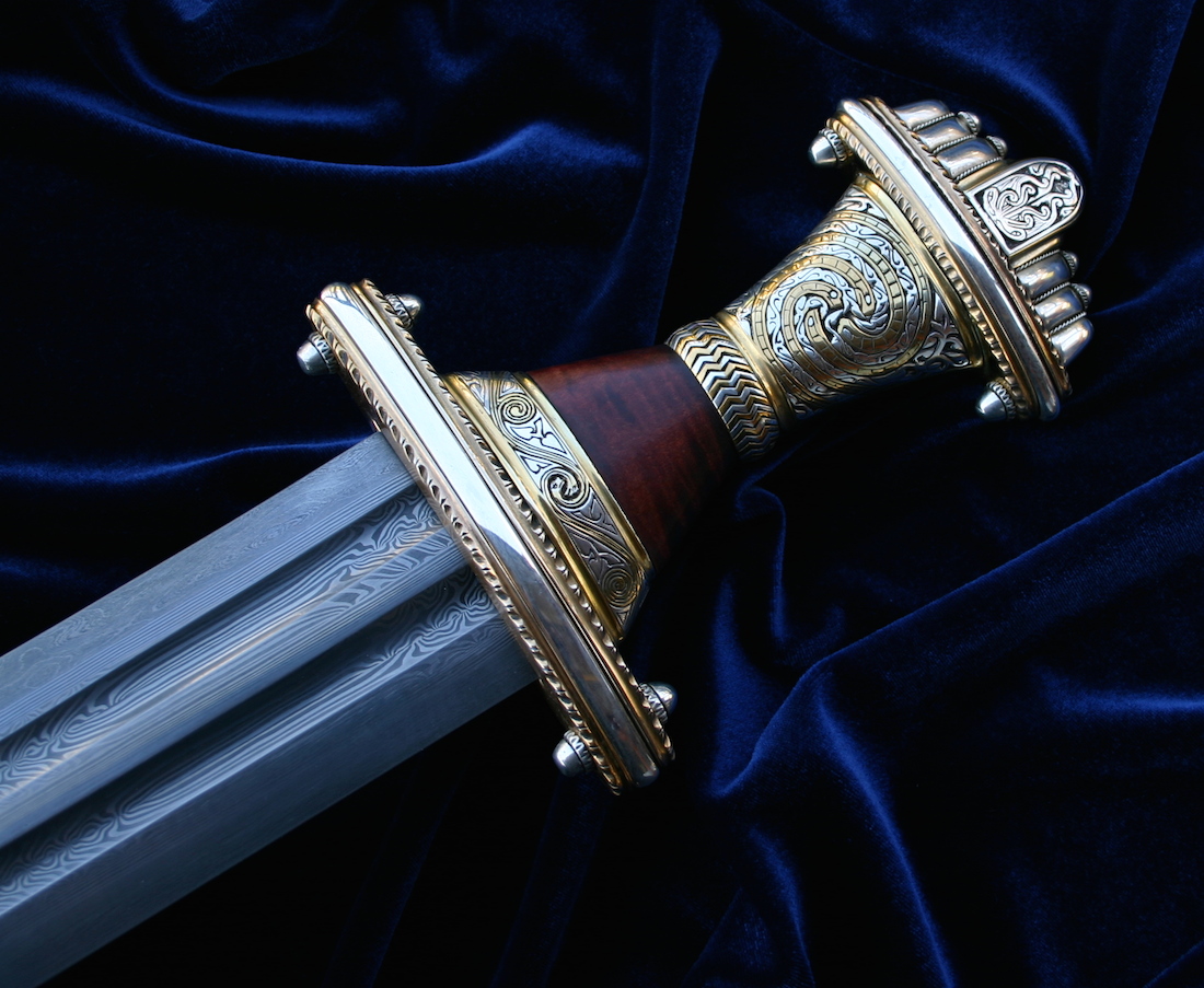 This is an extraordinary piece of work,combining the fine pattern welding skills of Mick Maxen with my own skills as a Master Swordsmith, there is nothing else quite like this available in the World today, a Kingly Sword made with the finest materials,Sterling silver,gilt worked and a seven bar blade.scabbard built to match.