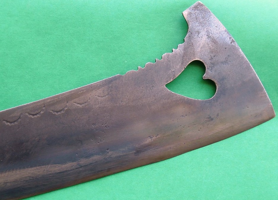 Now a brief point about vocabulary: in Italian, full size single edge billhooks are called roncola (roncole plur.), cleaver-like choppers ares called manaresso (manaressi plur.), and double edge, vine-prunning type of billhooks are called pennato (pennati plur.). A meat cleaver is called a mannaia (mannaie plur.), and manaresso and mannaia seem to sometimes be used interchangeably. The etymology of beindana is unclear, but it seems to me it may be related with the French word bédane, now a type of strong wood chisel mostly used for mortising, but for which etymological dictionnaries give completly flawed explanation (bec d'âne, donkey's beak). The latin name for a billhook, of the roncola/pennato type, is "falx". Fauchon (fr, used to mean falchion and short chrub scythe), falcione (it, for flachion and glaive), falchion (en, though from romance languages), facón (es, large knife), facão (po, large knife or machete) are augmentatives of the latin word falx.