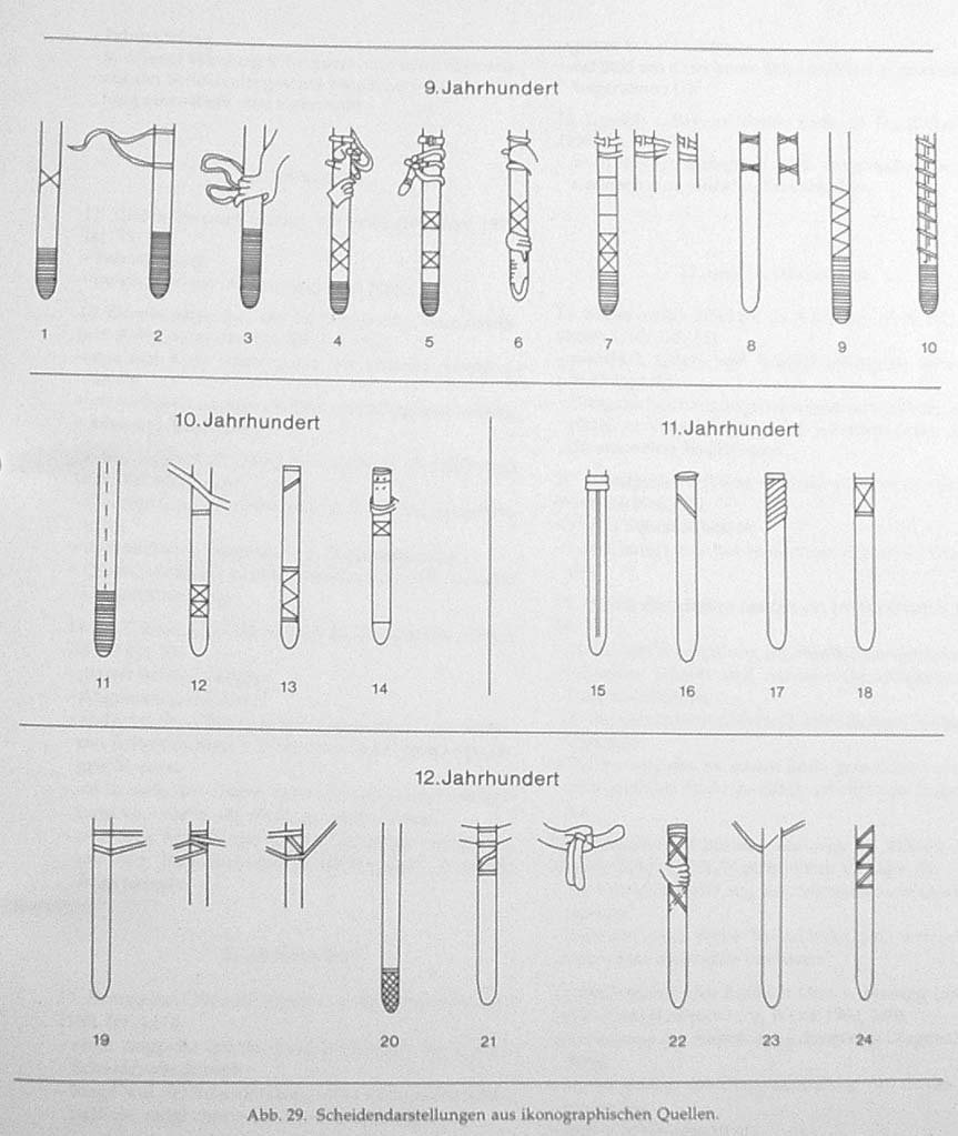 - The previous point may also explain the 'cross ties' i.e. X and Zig-Zag shaped cords or ribbons/straps that seem to be tied around some scabbards in illustrations. Perhaps they were there to keep the scabbard halves together?