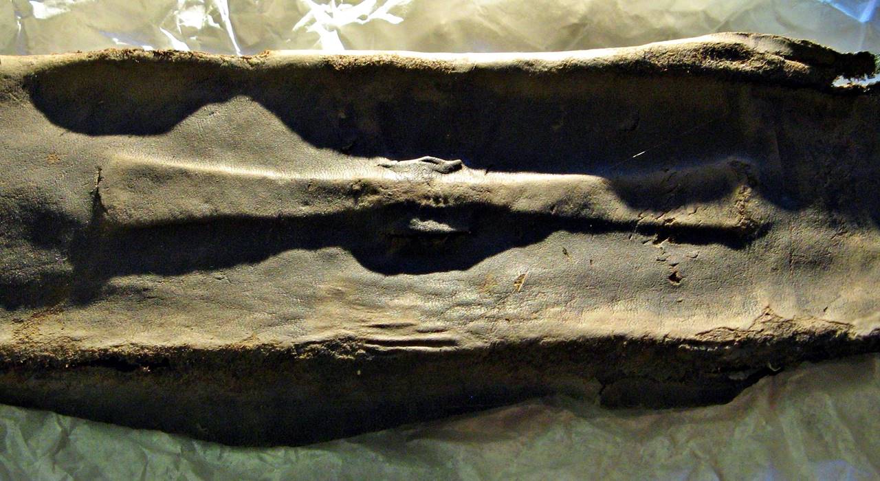 All that survives is the leather covering with the paired slits in for the strap to pass through and, in a couple of examples (most notably the one from Gloucester - I've attached some of the photos I took at Gloucester museum photos), the legacy mark of the slide itself survives imprinted on the inside of the leather.