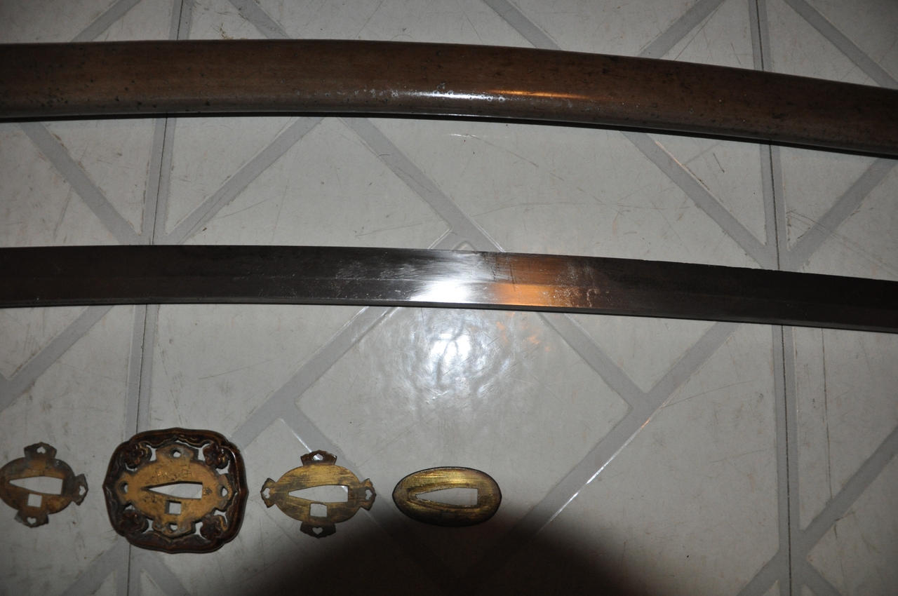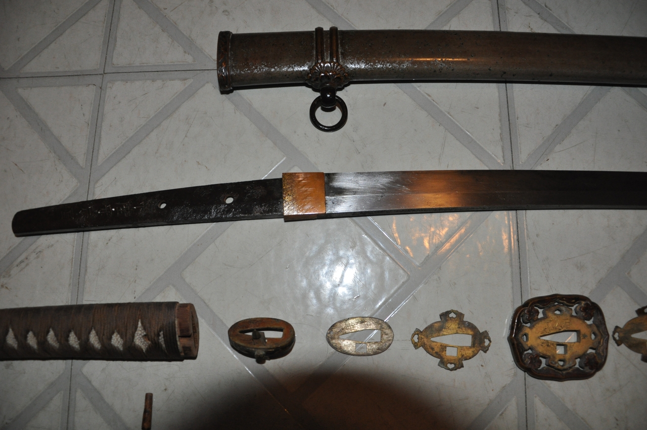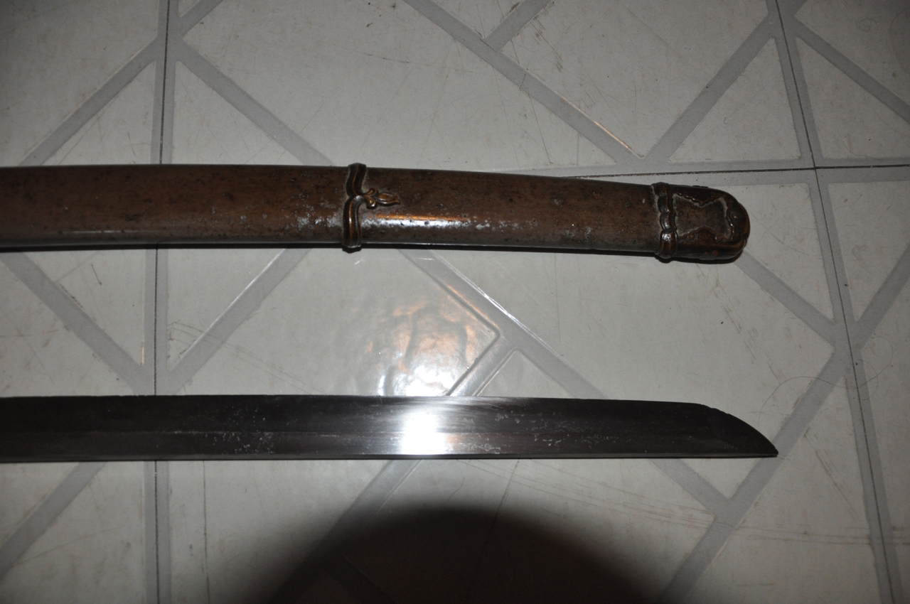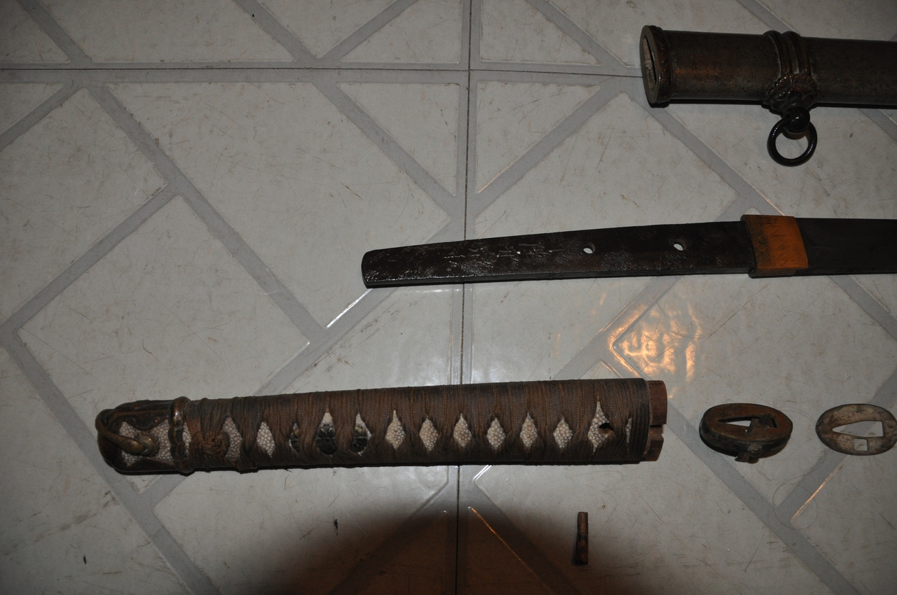 This example has what may be old handprints on the blade; there are areas of black staining on both sides, with very minimal pitting. More serious is that the blade appears to have been badly polished, so that there are fine scratches along its length and the hamon is not visible. The edge has some nicks. A proper polish would remove all of these flaws, but this blade probably isn’t worth the expense. It’s a factory-made blade (of the 1.200-per-year variety, rather than an elite artisan's 2-per-year or a mass-production factory's 12,000-per-year) with a marked tang. I’ve tried to show the tang markings in the photos below. The scabbard is steel with Army mounts, and the fittings are brass. All are well patinated but in good condition. The hilt’s organic materials are also in good condition, and the mounting is tight and solid.