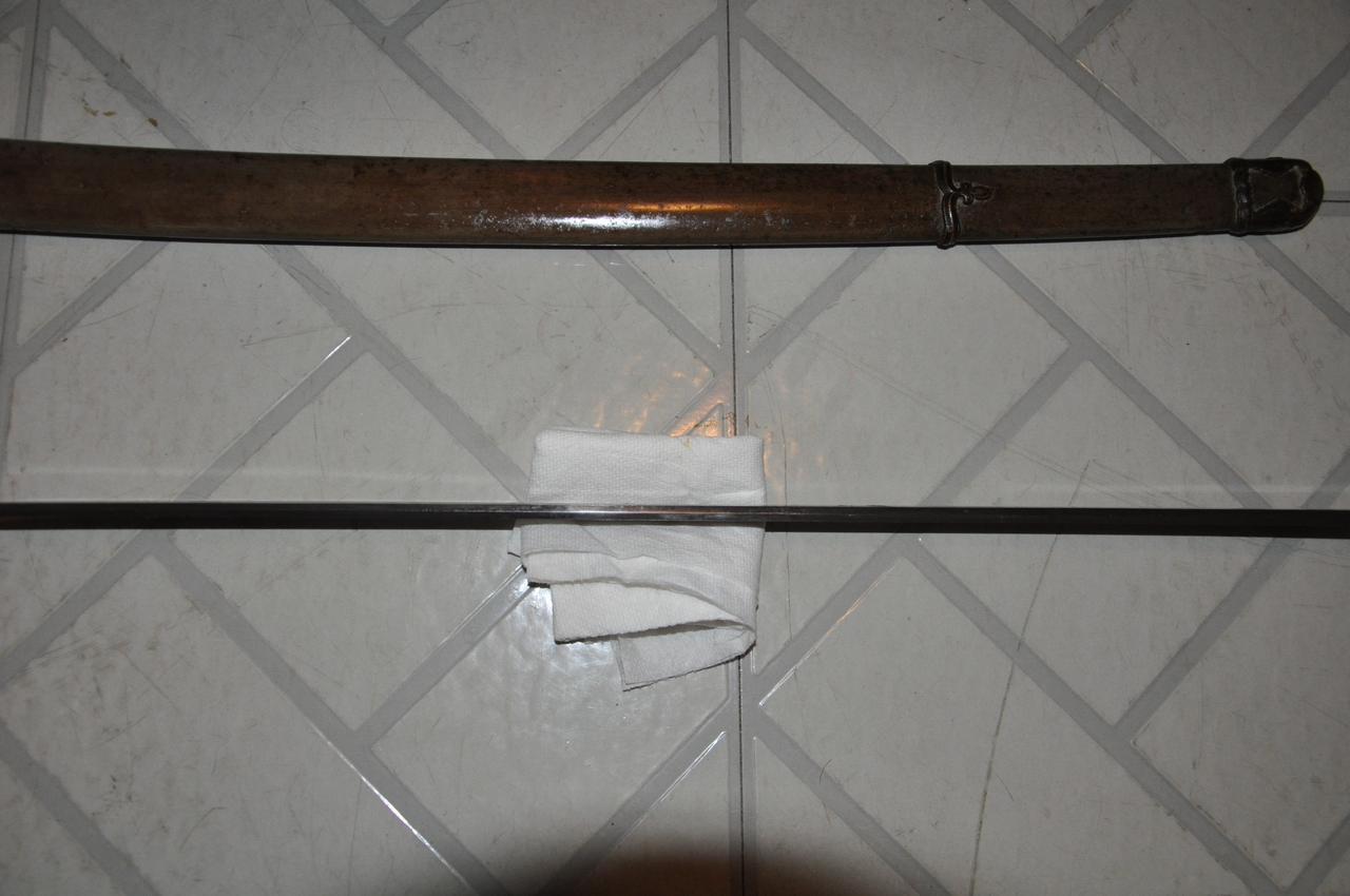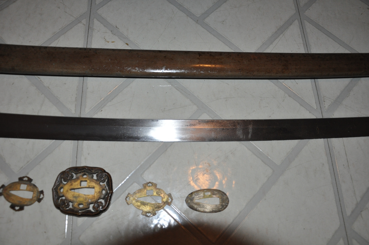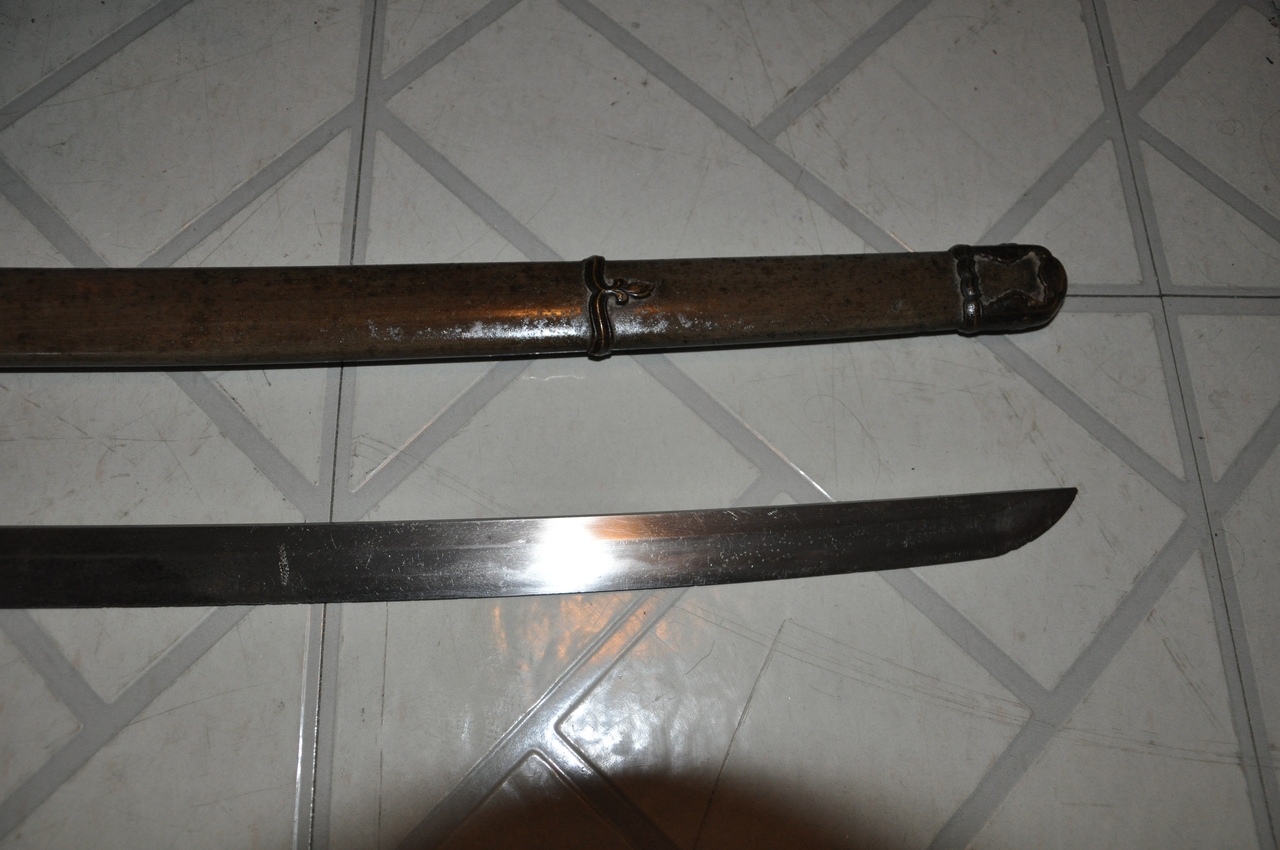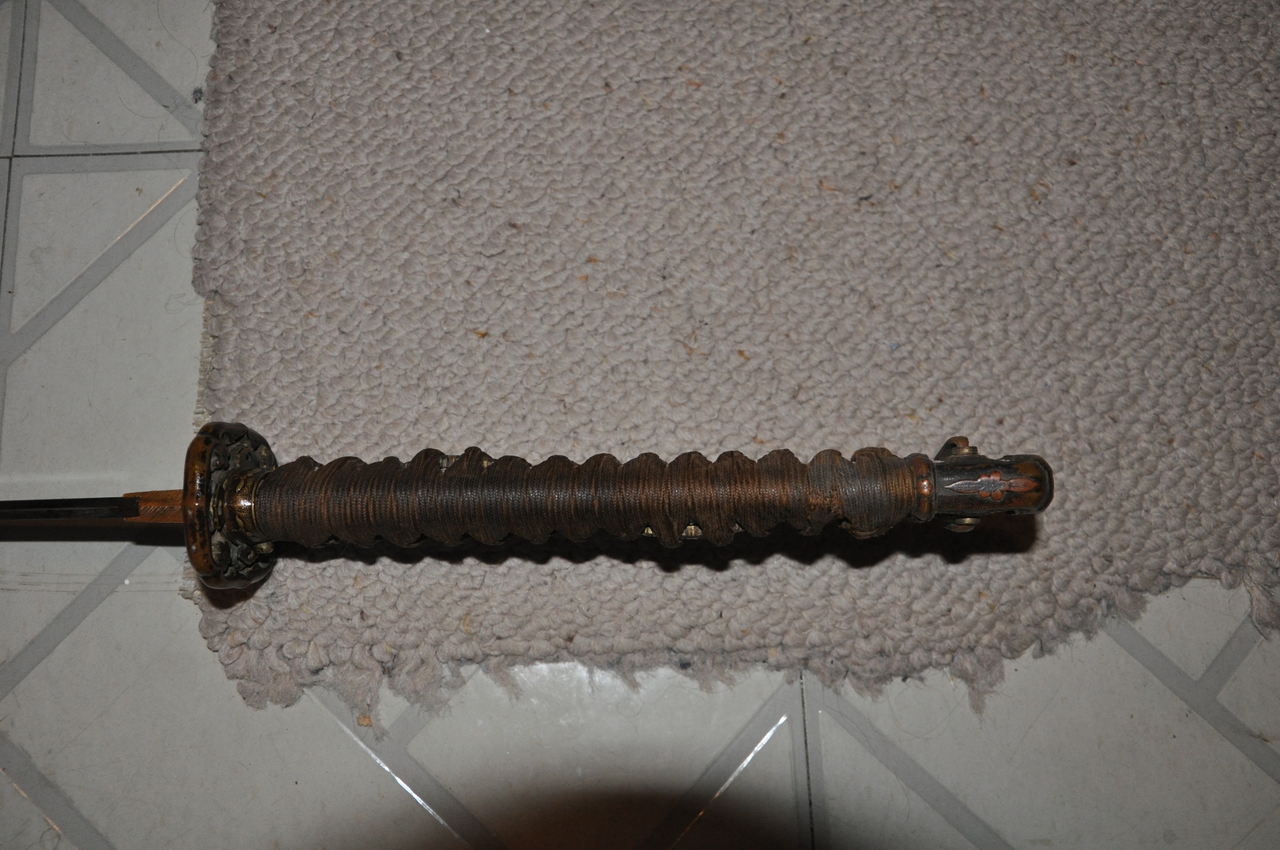 This example has what may be old handprints on the blade; there are areas of black staining on both sides, with very minimal pitting. More serious is that the blade appears to have been badly polished, so that there are fine scratches along its length and the hamon is not visible. The edge has some nicks. A proper polish would remove all of these flaws, but this blade probably isn’t worth the expense. It’s a factory-made blade (of the 1.200-per-year variety, rather than an elite artisan's 2-per-year or a mass-production factory's 12,000-per-year) with a marked tang. I’ve tried to show the tang markings in the photos below. The scabbard is steel with Army mounts, and the fittings are brass. All are well patinated but in good condition. The hilt’s organic materials are also in good condition, and the mounting is tight and solid.