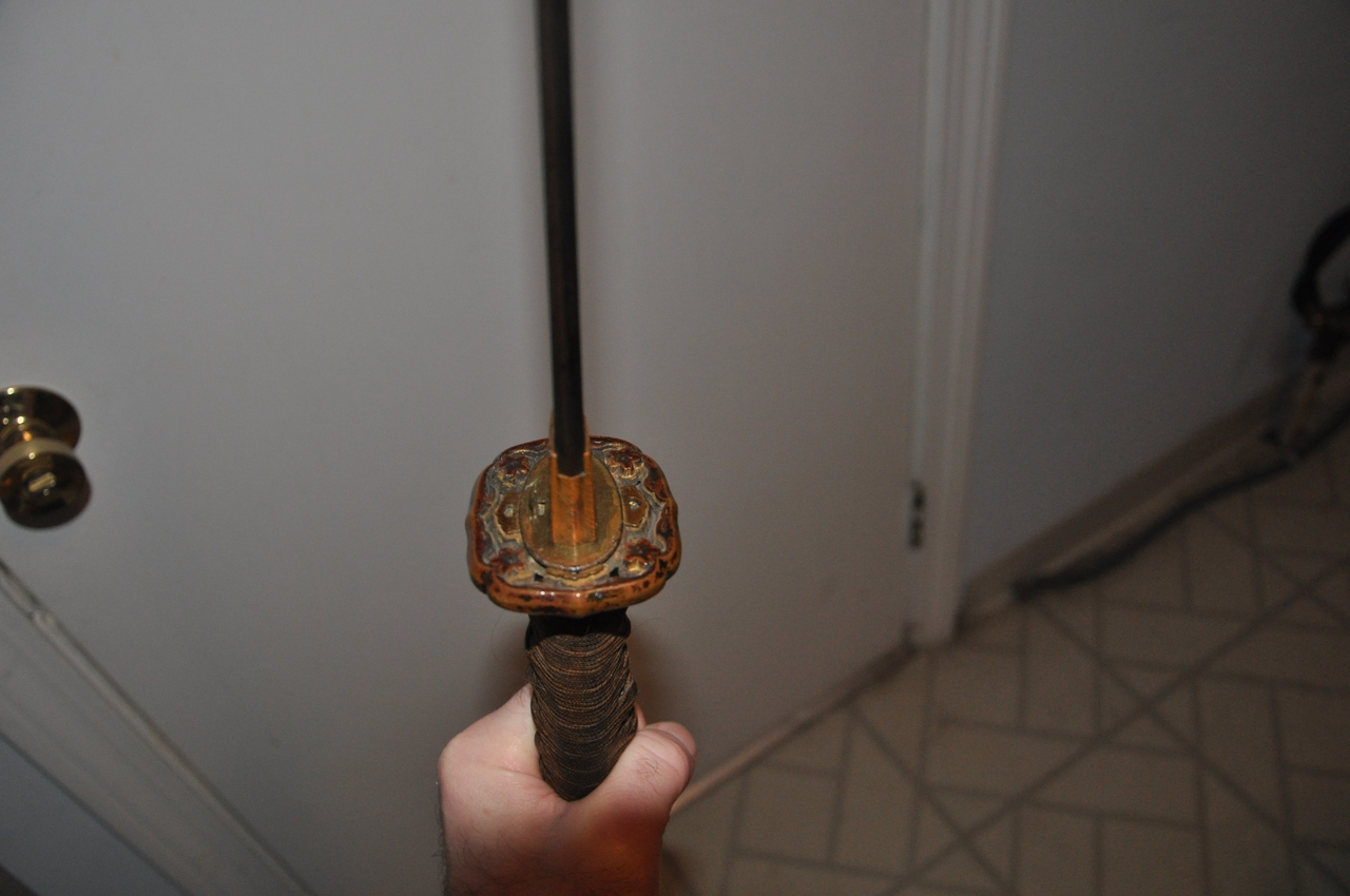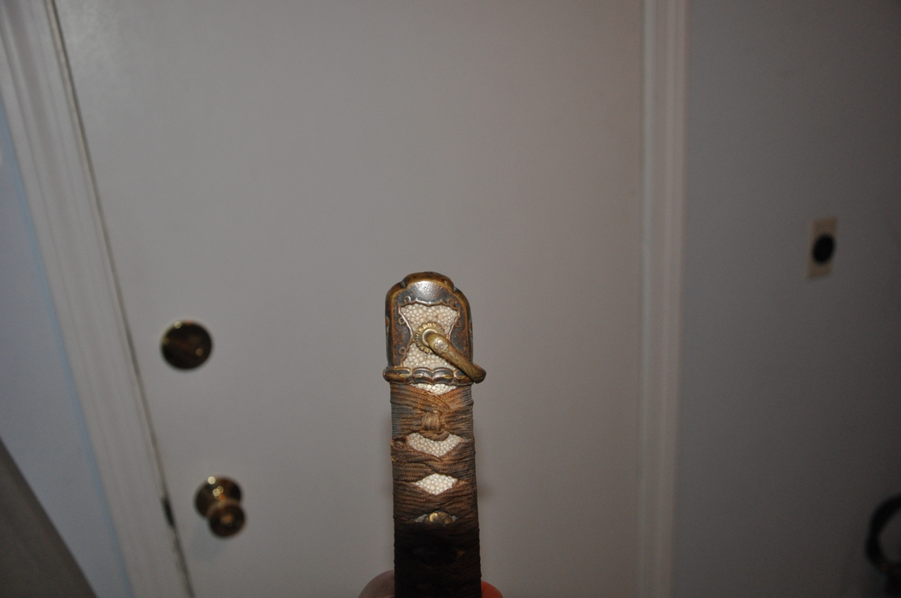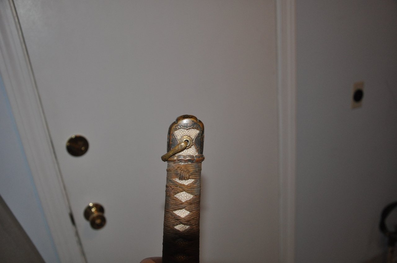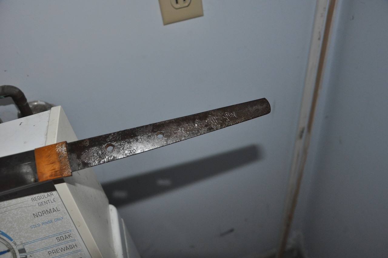 This example has what may be old handprints on the blade; there are areas of black staining on both sides, with very minimal pitting. More serious is that the blade appears to have been badly polished, so that there are fine scratches along its length and the hamon is not visible. The edge has some nicks. A proper polish would remove all of these flaws, but this blade probably isn’t worth the expense. It’s a factory-made blade (of the 1.200-per-year variety, rather than an elite artisan's 2-per-year or a mass-production factory's 12,000-per-year) with a marked tang. I’ve tried to show the tang markings in the photos below. The scabbard is steel with Army mounts, and the fittings are brass. All are well patinated but in good condition. The hilt’s organic materials are also in good condition, and the mounting is tight and solid.