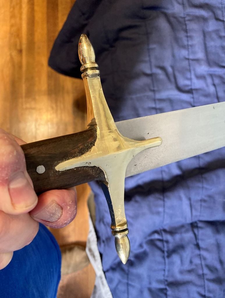And now we come to the hilt, and here is where the disappointment kicks in. The guard itself is rough, with uncomfortable edges and obvious grinding flaws all around. Also, the forward quillon is out of alignment with the rear quillon – it looks odd, if you look closely. Due to the grinding marks, I’m pretty sure that the guard is made by grinding and not by casting (not that either way is necessarily preferable, but I can’t help but to think that if the guard had been cast, it would have come out better). The wooden grips aren’t uncomfortable, but the finishing job looks kind of rough and sloppy. There is some kind of ugly material in the space between the wood grips and the brass guard – is it epoxy or just putty? Don’t know. Whatever it is, it looks bad. If you’re using this as a display sword, just make sure no one gets a close-up of it.